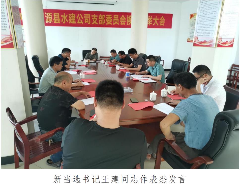 大會復會后,新當選的支部委員會書記王建同志作了表態(tài)發(fā)言,他說:在新的任期內,將不辜負全體黨員的信 任和期望,始終堅持以習近平新時代中國特色社會主義思 想為指導,在水利局黨組和局機關黨委的正確領導和指導 下,積極履行黨建工作“第一責任人”職責,團結帶領廣 大黨員干部,恪盡職守,以更高的熱情、更多的精力、更 強的工作力度做好公司的黨建工作,促進公司的各項工作 順利開展。